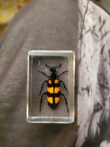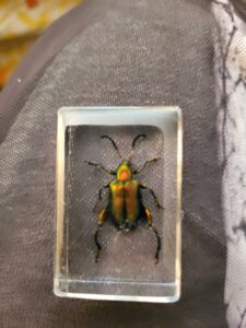 1 – Jeweled Frog Beetle (S. Buqueti) This beetle in resin has beautiful iridescent colors which seem to change depending on how you look at it. It’s strong hind legs are used for male -to-male combat and defense.
