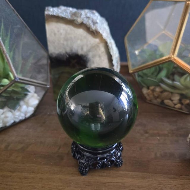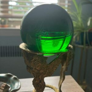 Our crystal balls and gazing balls are optically pure and the highest quality available. This Dark Green Crystal Ball has been hand polished to a perfectly smooth sphere. This piece has a gorgeous deeply dark green color and, with the right light shows its vibrancy.