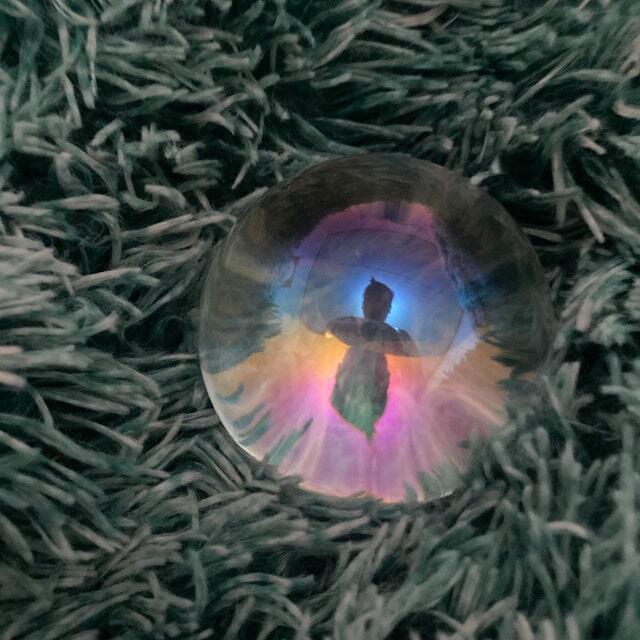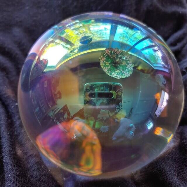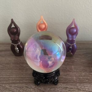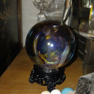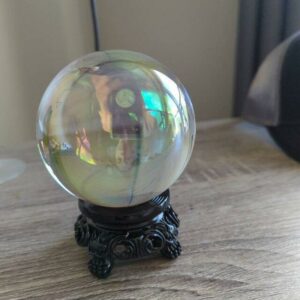 This beautiful rainbow glass sphere is brand new and never used. It has been hand polished to a near flawless sphere. The soft rainbow colors are reminiscent of bubbles. We call this crystal ball the Aurora – like the natural lights displayed in the Earth’s sky called the Aurora Borealis, or Northern lights, visible only in high-latitude regions.