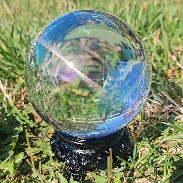 Size is 80mm ( a little over 3 inches in diameter) and comes with your choice of a free clear lucite stand (style can vary) or a lovely black ornate stand as seen in photos. This is a processed item, made of quartz and glass mixture. This is the only way to obtain this level of clarity and flawlessness.