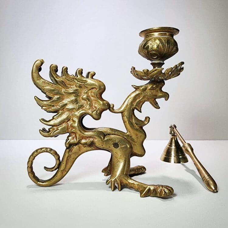 Extremely rare. This exquisite brass candle holder is in the shape of a classic Victorian Griffin or Dragon. Designed as if ready to pounce, the candle rest atop of its head like a crown.