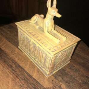 This Egyptian Antique Tomb style box features many Egyptian Guardians and the Wadjet All Seeing Eye of Horus. Sitting on the top of the box is the God Of Afterlife Anubis.