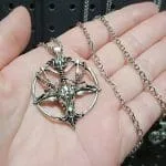 This detailed Baphomet Pendant has a beautiful antique silver color finish and comes on a 20″ chain and pendant measures approximately 1 1/2 inches wide.