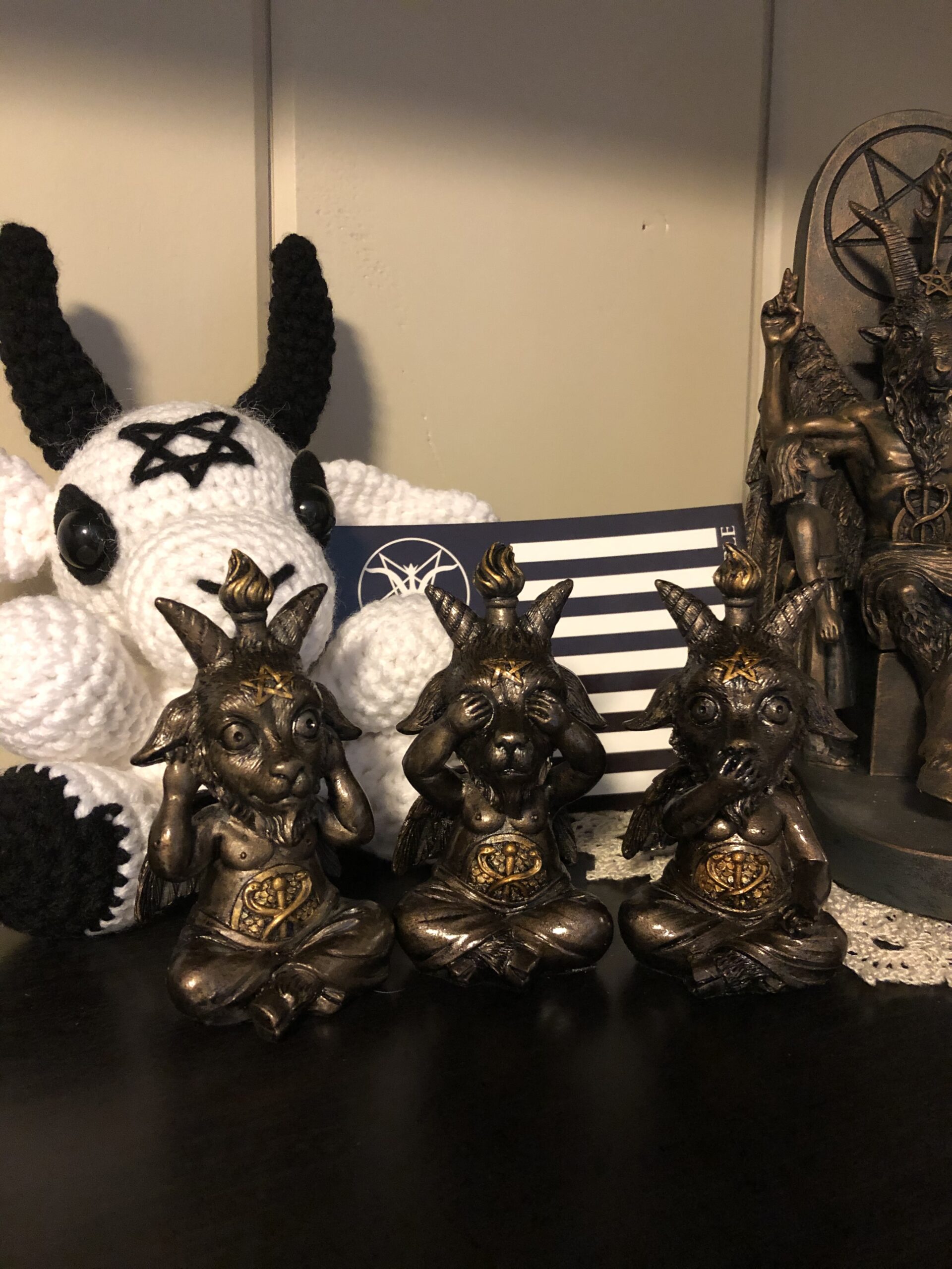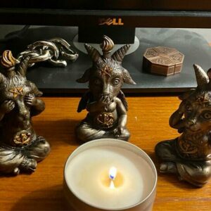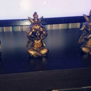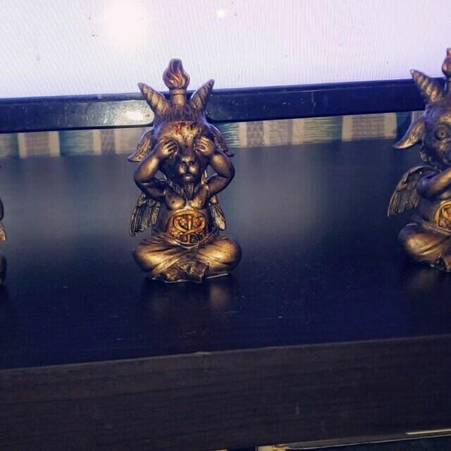 Undeniably charming and uniquely macabre, this set of three Baphomet statues offers a new take on the classic “Hear No Evil, See No Evil, Speak No Evil” motif.
