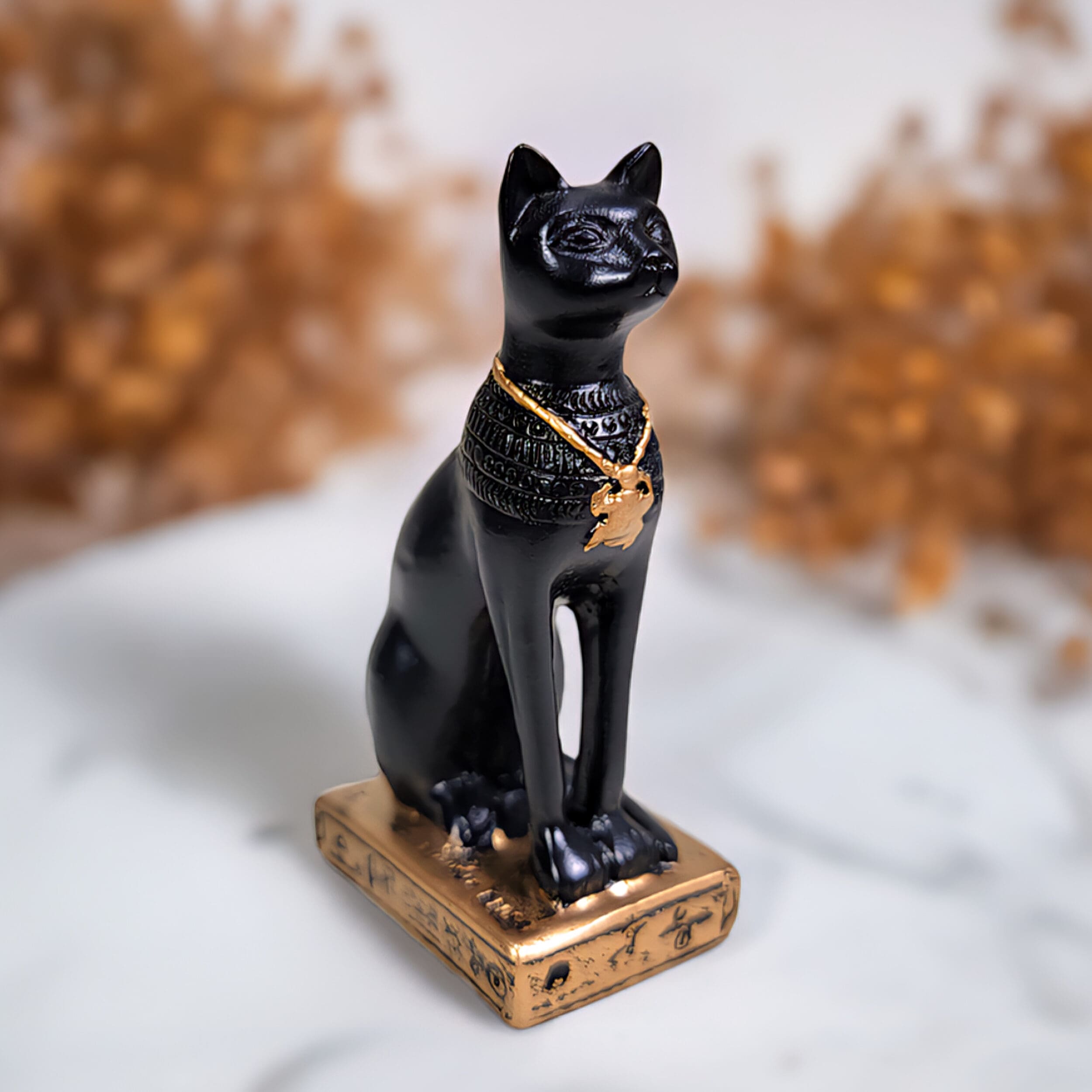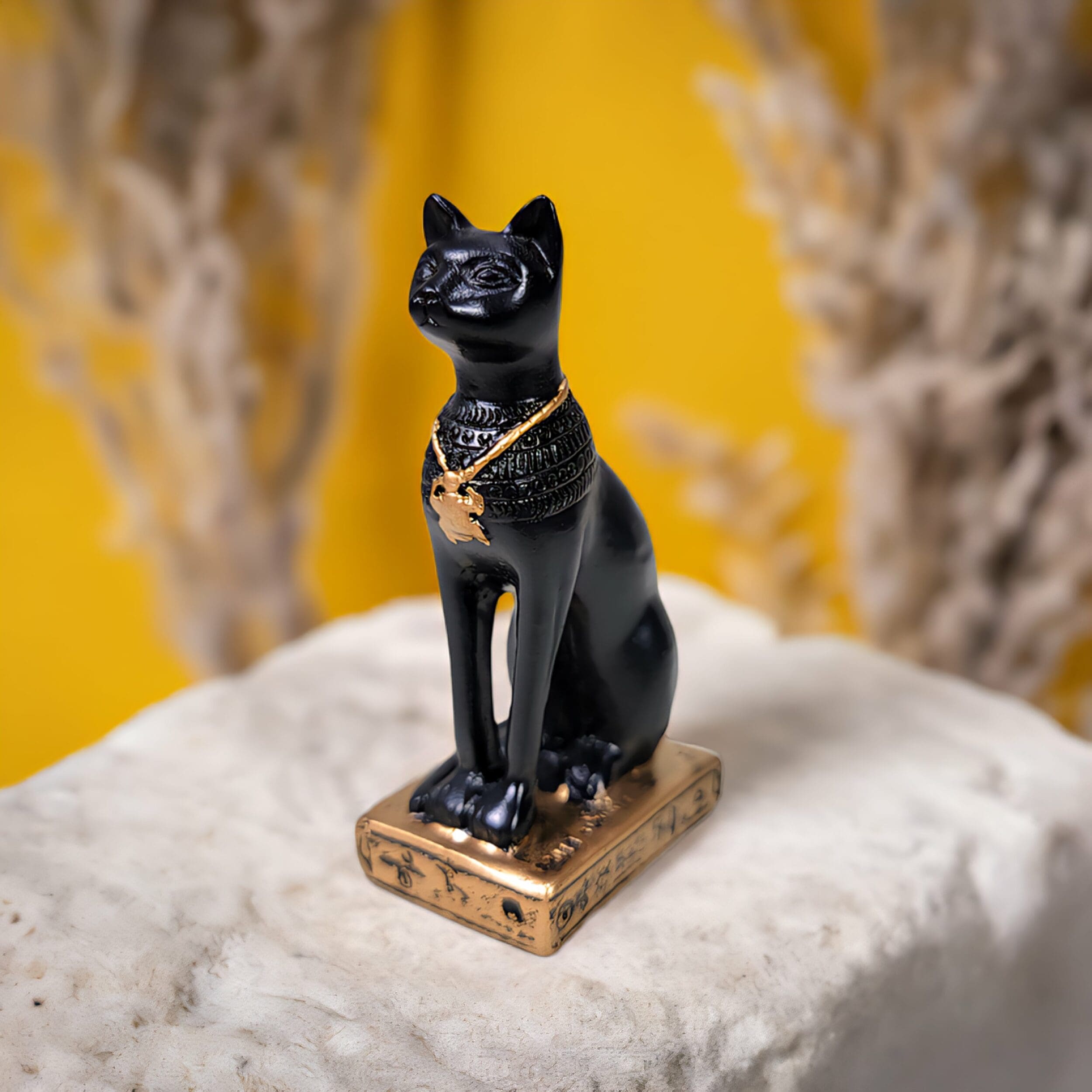 Meet your Pocket Bastet — a 3-inch tiny statue of the Egyptian goddess in her cat form, perfect for your altar, shelf, or small shrine. This sleek black feline sits proud on a golden base etched with hieroglyphics, wearing a gold scarab beetle necklace like the divine royalty she is.