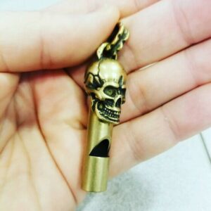 This brand new brass whistle showcases a detailed human skull design. When blown, it emits a loud and commanding sound. It has has a nice weight to it too. Let it become your go-to accessory for both practically and a touch of the unusual.