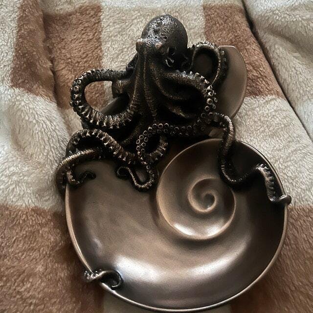 Octopus Vanity Tray. This dark bronze colored vanity tray has a cute little octopus wrapped around a spiraled half sea shell. This is an elegant piece that would easily flow into most interior design and would be a perfect bowl to place your jewelry. Perhaps you need to add to your ocean decor or just need a place to stash your wedding ring while you wash your hands. Either way, his detailed tentacles seem ready to protect your precious little items.
