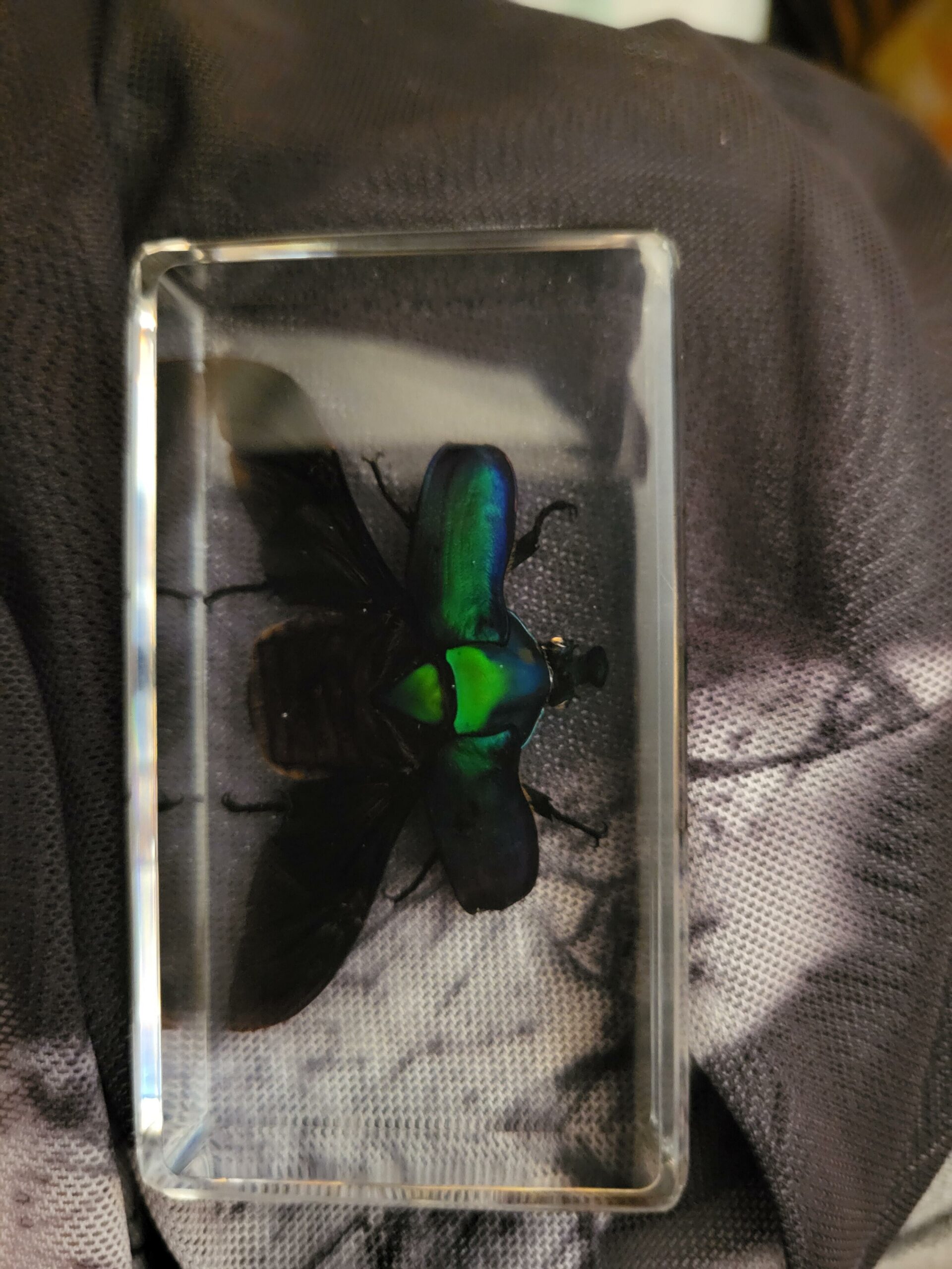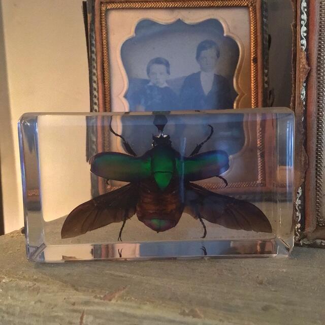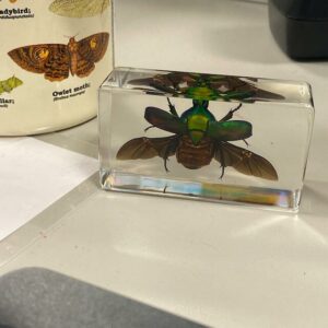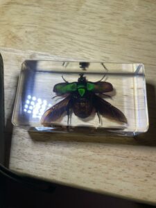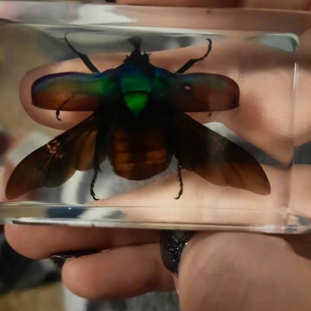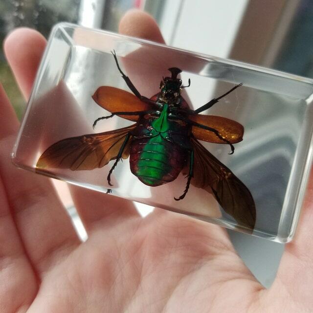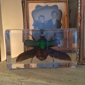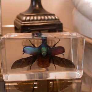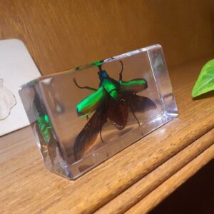 Approved by USFWS (Fish & Wildlife) legally obtained. A stunning Resin display of a Rose Chafer Beetle with it’s wings open. The dark shades of green and an iridescent rainbow of colors are beautiful! Photos don’t do it justice. This insect in resin makes for an excellent educational display, decoration for your home, or great addition to your Insects and Oddities collection. Lucite block measures approx. 2 3/4 inches wide, 1 1/2 inches high.