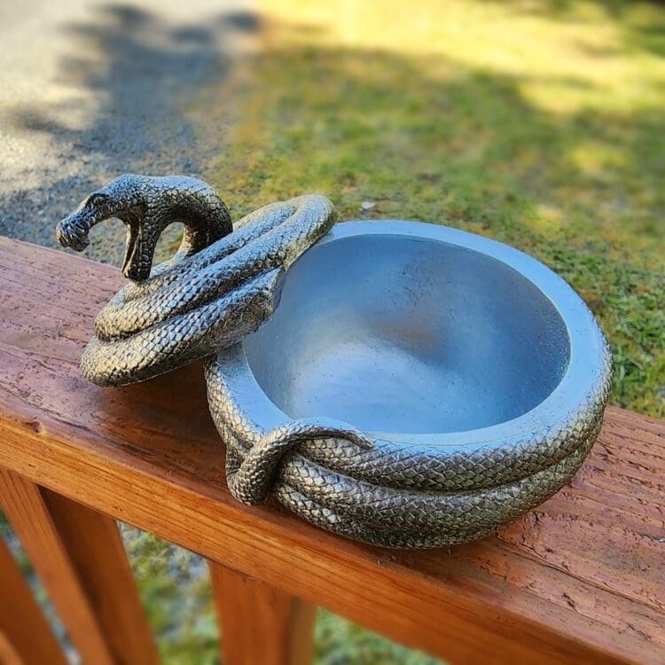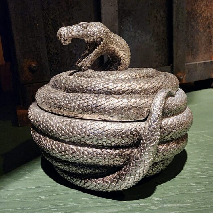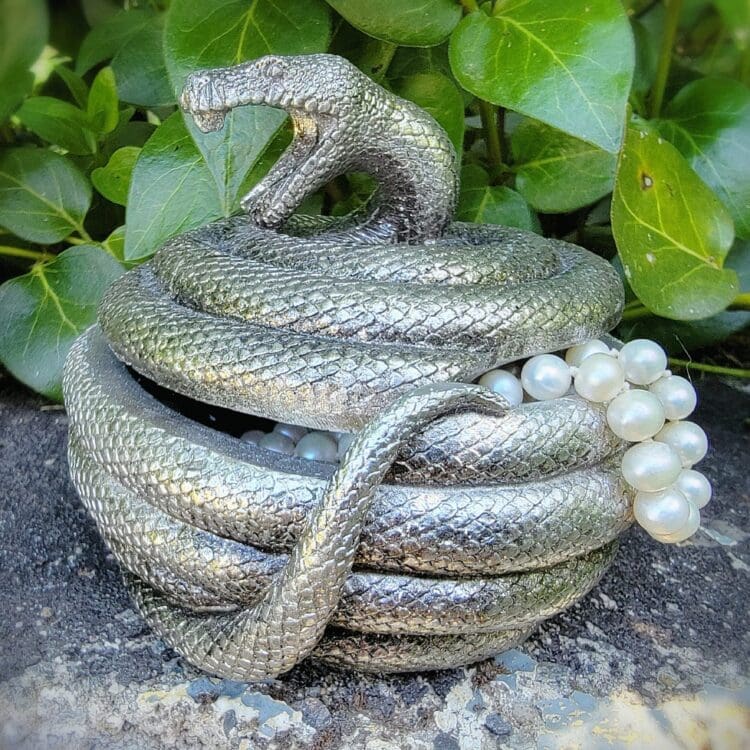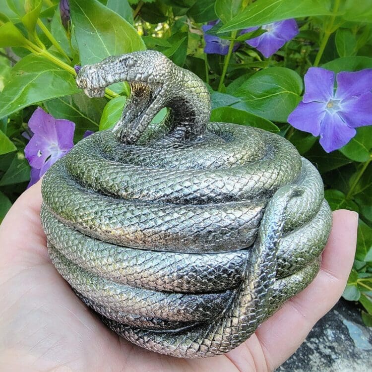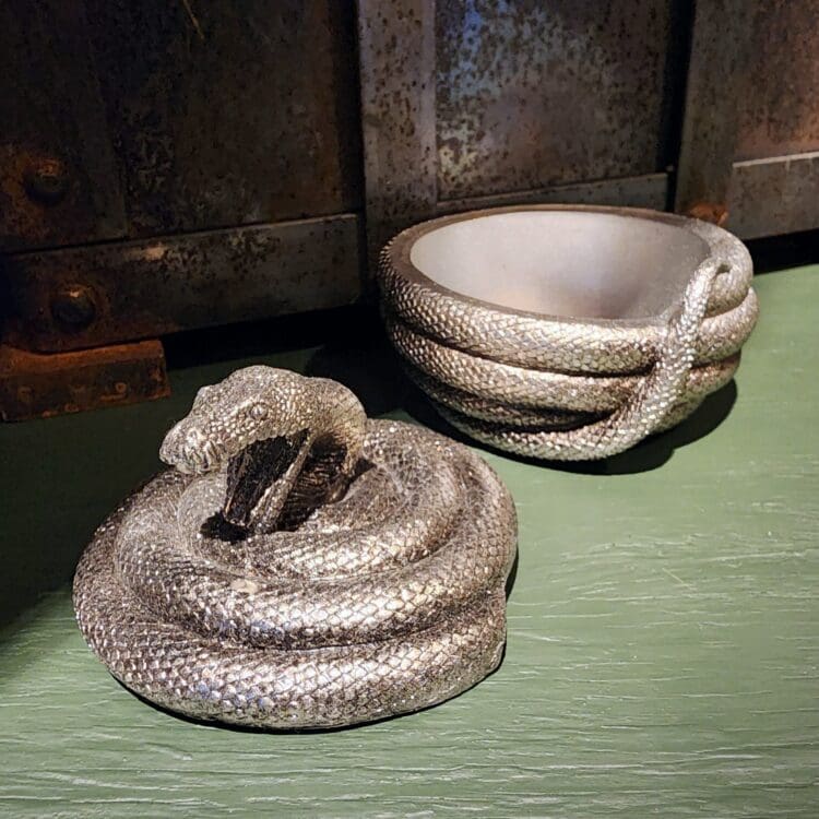 The coiled body of the snake opens up to reveal a spacious compartment that’s perfect for storing your favorite jewelry pieces or other small treasures. Whether you’re a fan of gothic style or simply appreciate the beauty of snakes, this trinket box is truly an unusual piece that will add a touch of mystique to any room.