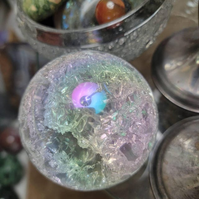 This mesmerizing rainbow glass ball has what is considered a crackle effect. A delicate technique has been used to send random hairline cracks throughout, giving it an amazing sparkle. It is then plated with an Aurora finish, the soft rainbow colors are reminiscent of soap bubbles. We call this crystal ball the Crackle Aurora – similar to the natural lights displayed in the Earth’s sky called the Aurora Borealis, or Northern lights.