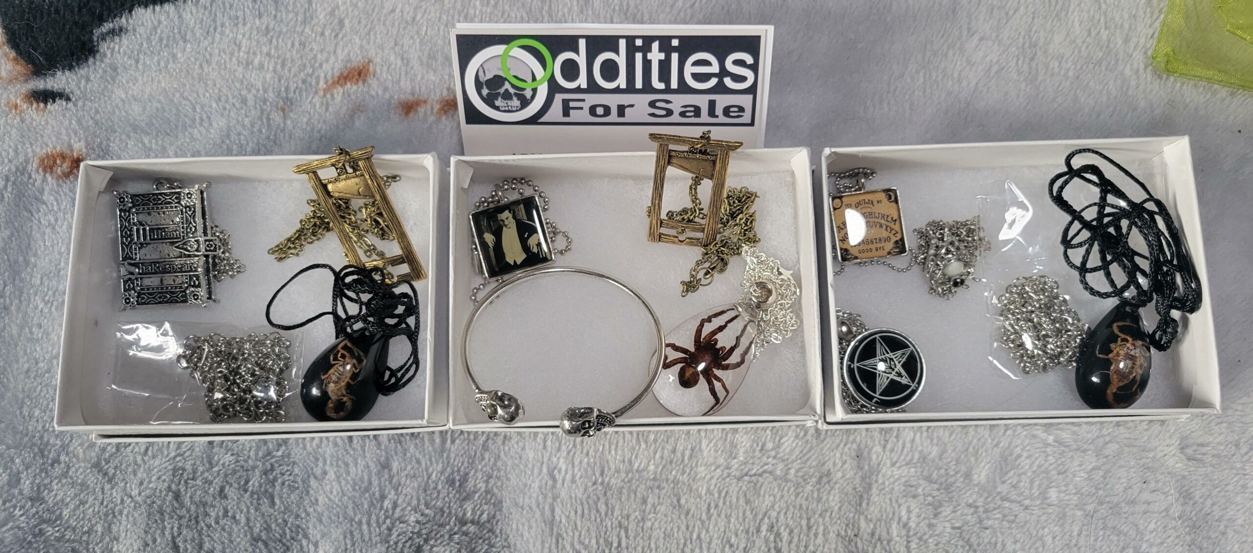 I absolutely love these jewelry sets such a great bargain, even with the small flaws they are st amazing pieces. I have orded 2 more sets witch should be delivered today. I would have to say my favorites out of my first 3 set are my Orb Weaver spider in resin, my Shakespeare lockett and my Adorable itty-bitty bat clutching a pearl necklace so adorable love ❤️❤️❤️ definitely recommend you can't beat the price. And of course David Stephanie and Mos are awesome 😎