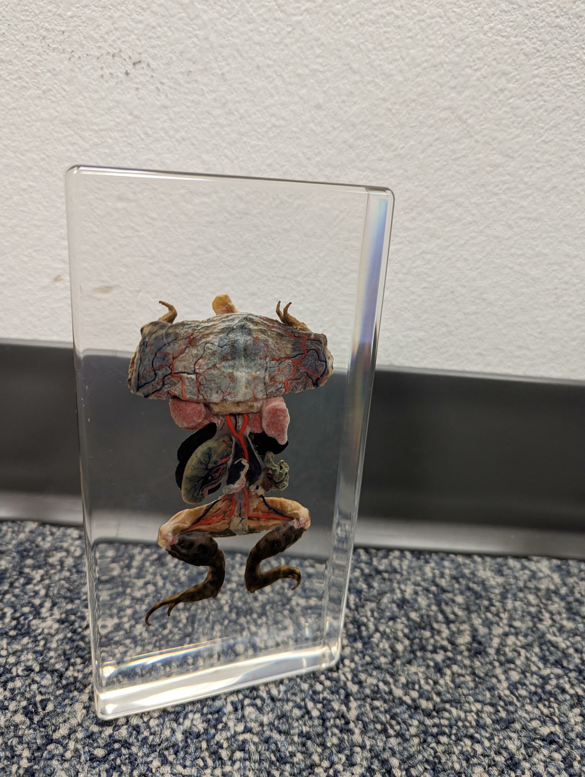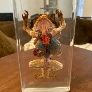 Approved by USFWS (Fish & Wildlife) legally obtained. This amazing specimen in resin is that of a large dissected toad. (Bufo Garagarizans) Encased in crystal clear resin, it is viewable from all angles. It’s arteries and veins have been plasticized to aid even further with identifying various internal organs. Not only is this dissected toad in resin an excellent education piece, it’s also a unique piece to add to any oddities and curiosities collection.