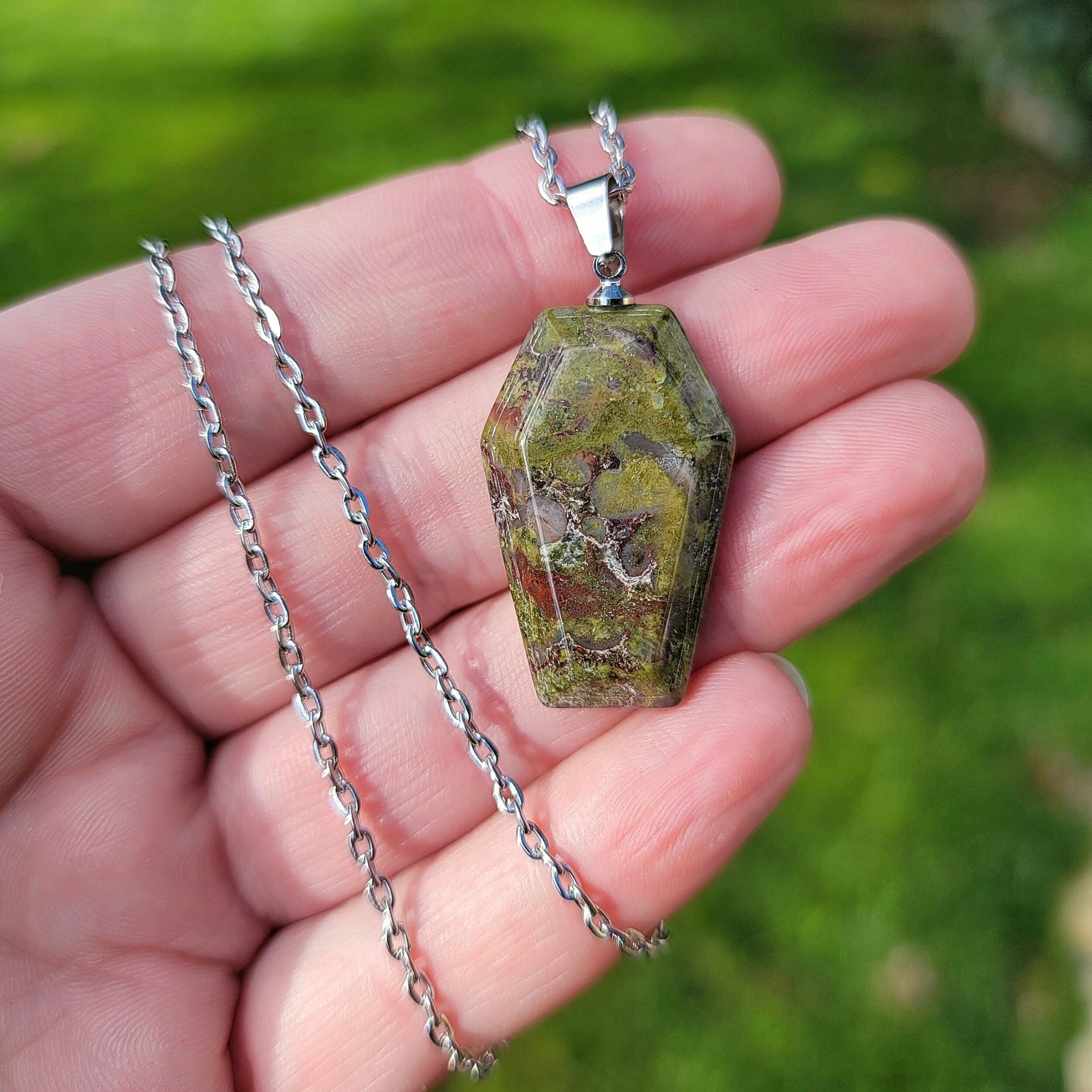Channel dark elegance with this coffin-shaped Dragon’s Blood Jasper necklace, a bold fusion of gothic allure and natural beauty. The Dragon’s Blood Jasper displays its rich, marbled hues, symbolizing courage, vitality, and grounding—both a protective talisman and a captivating statement piece.
