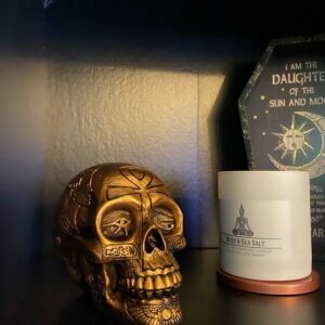 This Egyptian Skull is Intricately sculpted and embellished with Ancient Egyptian symbols and hieroglyphs. Highlighted on the left of the skull is King Akhenaten, on the right is Queen Nefertiti with an Ankh over the upper face. This would be a wonderful addition to any Egyptian decor or Mummy display.