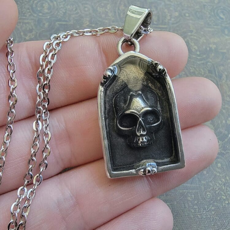 Embedded Skull Necklace, Gothic Tombstone Pendant, Memento Mori