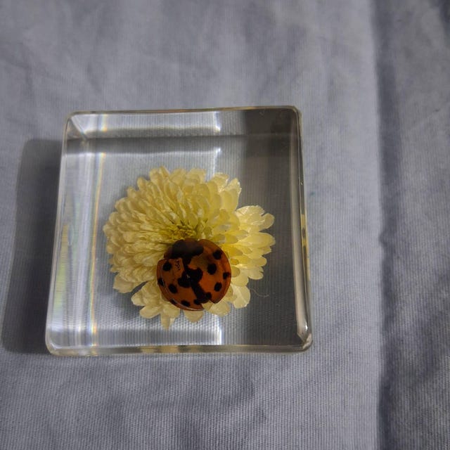 This cute piece is a tiny ladybug with flower in resin. Also called the thirteen-spot ladybeetle or ladybird beetles, the scientific name is Hippodamia tredecimpunctata. Being visible from all angles, it makes for a nice little teaching tool, the crystal clear lucite makes it so you can see every detail. The addition of the beautiful flower makes this a cute little gift.