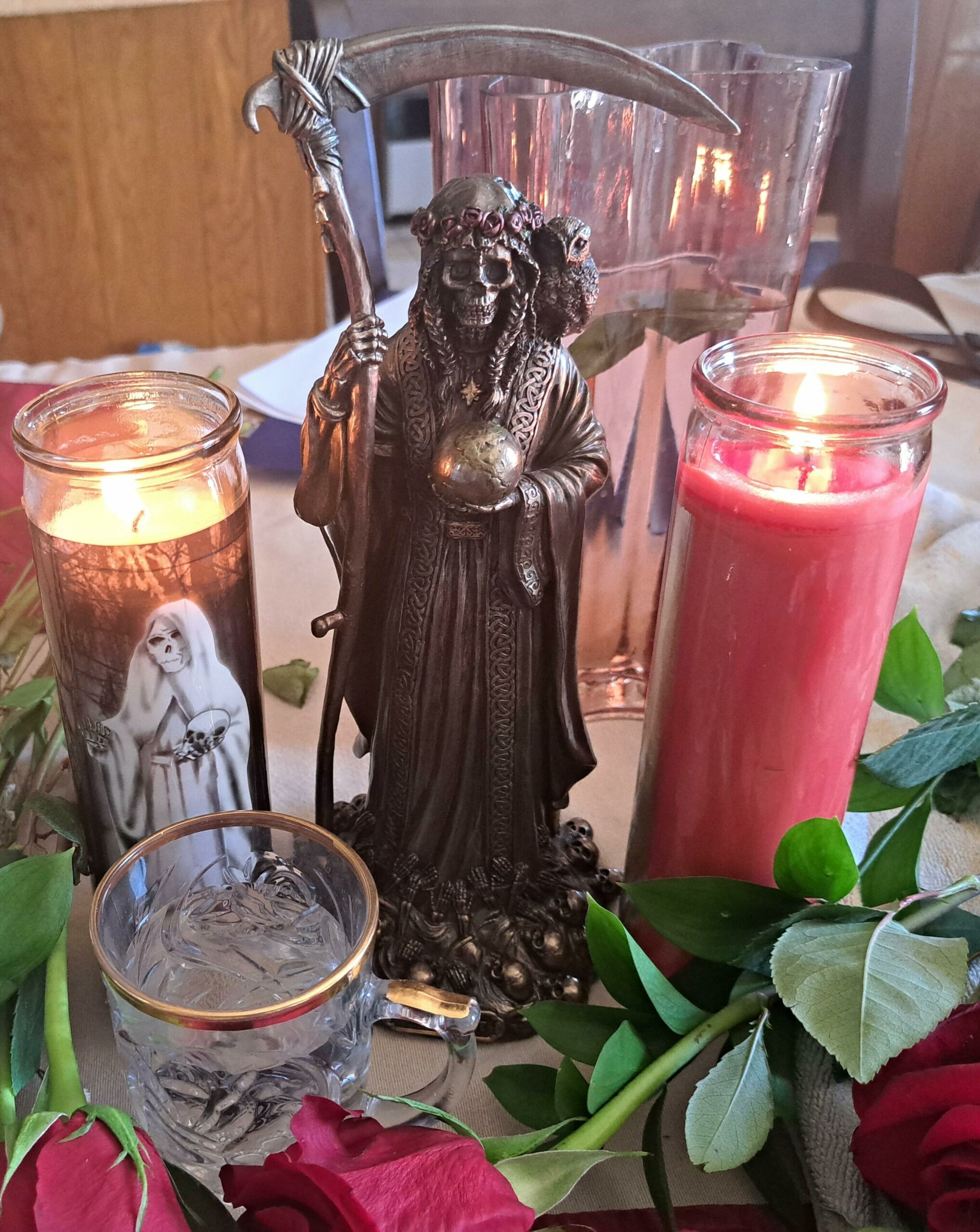 Our Lady of Holy Death (Nuestra Señora de la Santa Muerte) is the personification of Death. She symbolizes healing and protection as she is the female reaper deity that will safely ushers souls into the afterlife. She has become an icon of Day of the Dead otherwise known as Dia de Muertos.