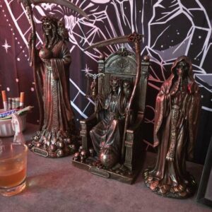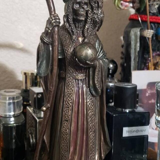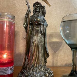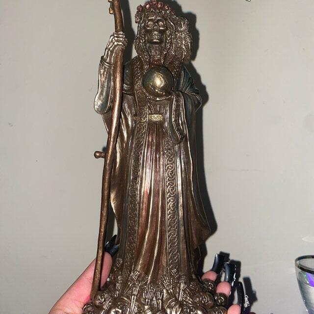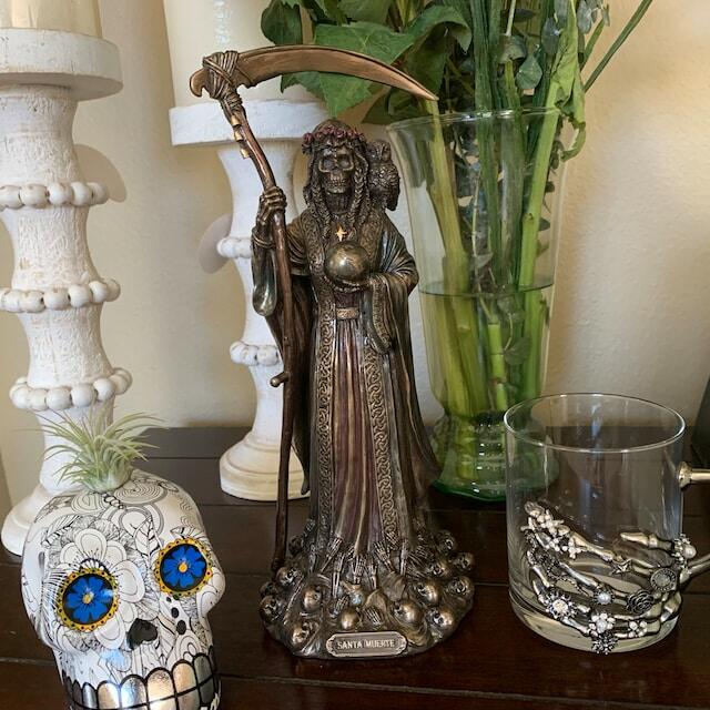 This Beautiful Santa Muerte Bronze Statue would be a stunning addition to any home or DÃa de Muertos Altar. This is a powerful piece with exquisite detail covering every inch. The pictures do not do her justice. She stands holding her scythe in one hand and in the other a Globe. At her feet, several skeletons seems to crawl out of the earth and claw at her robe. Perched upon her shoulder is an owl which is her messenger.