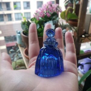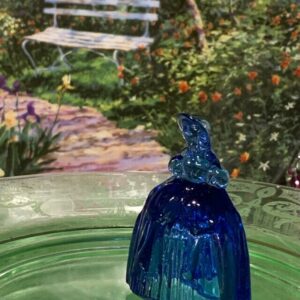 In perfect condition, this vintage style, tiny figurine is in perfect condition with no damage. When exposed to a black light, this cobalt blue uranium glass figure is reminiscent of a mini Victorian ghost with eerie blues and greens. Standing approx. 2 1/8 inches tall. Small, Blue, Vaseline Glass girl with bonnet.