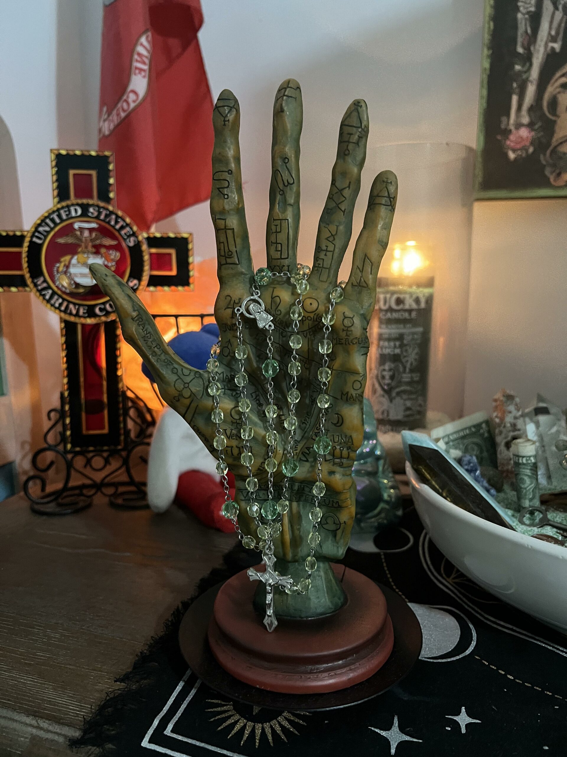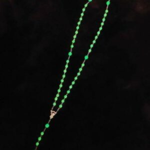 This rare Uranium Glass Rosary is hand beaded using vintage, faceted, uranium glass beads. The “Our Father” beads are slightly larger (8mm) and a bit deeper green than the “Hail Mary” beads (6mm.) This variation is more traditional and gives it a beautiful, pale green color variation in natural light.