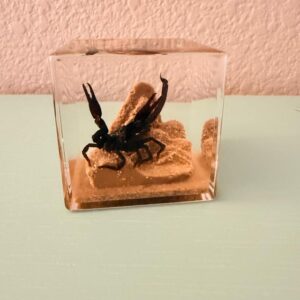 Approved by USFWS (Fish & Wildlife) legally obtained. This real scorpion in resin is meticulously placed and positioned within a tiny faux habitat. In a defensive pose, hidden amongst the sand dunes, an entire little world within a small solid cube. This black scorpion diorama display makes for a great unique gift. It’s absolutely perfect for a desktop or unique addition to any insect collection.
