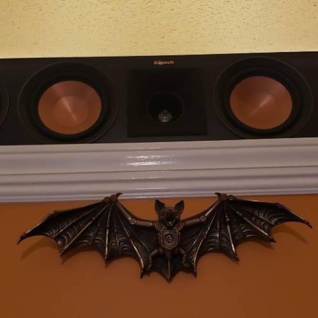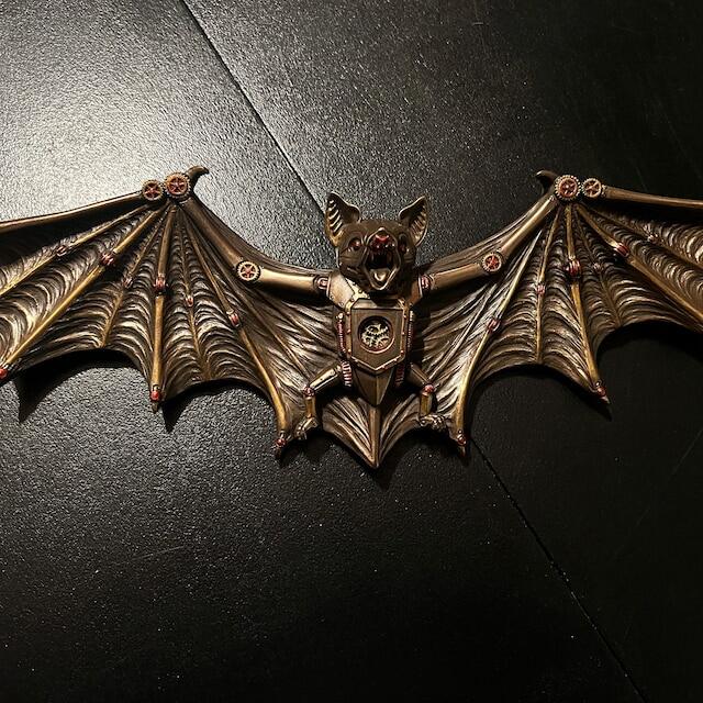 This bronze bat wall plaque would be a perfect addition to any steampunk or gothic decor. Its mechanical looking wings are outstretched as if flying and his mouth is open wide showing his fangs.