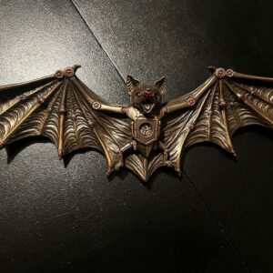 Made of a bronze poly stone and hand painted color accents. Our Steampunk bat measures approximately 13 1/2 inches wide and has two pieces attached to the back for easy wall hanging.