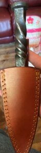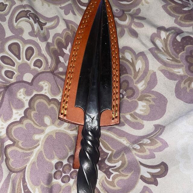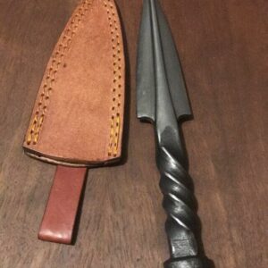 This Twisted Steel style athame is crafted with strong artistry. This surprisingly heavy piece would be a powerful addition to any altar or simply a beautiful piece for a collector. This Athame is a solid, hand forged steel with a black twisted handed. Blade comes with nice thick, real leather sheath with attached belt loop.
