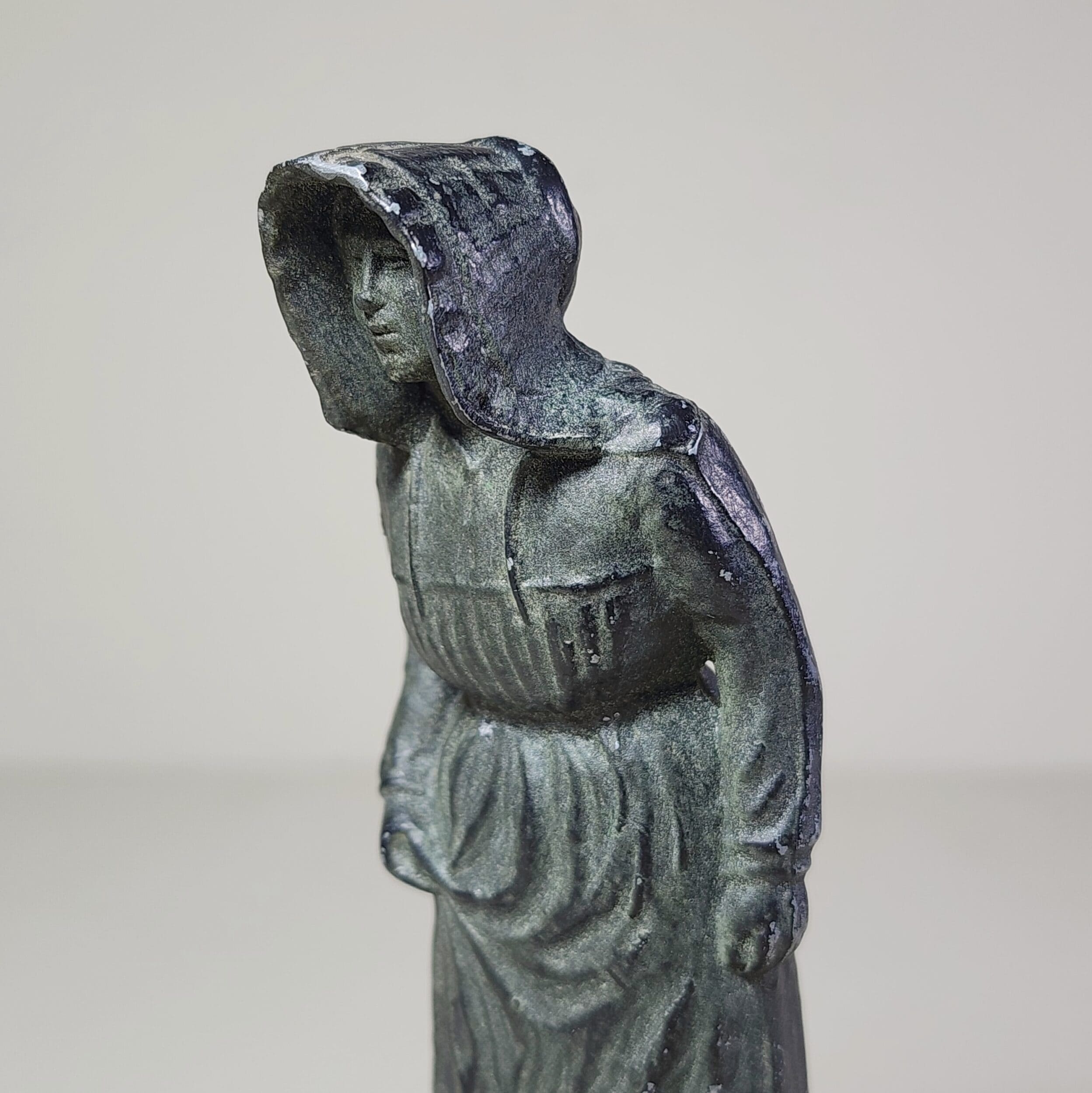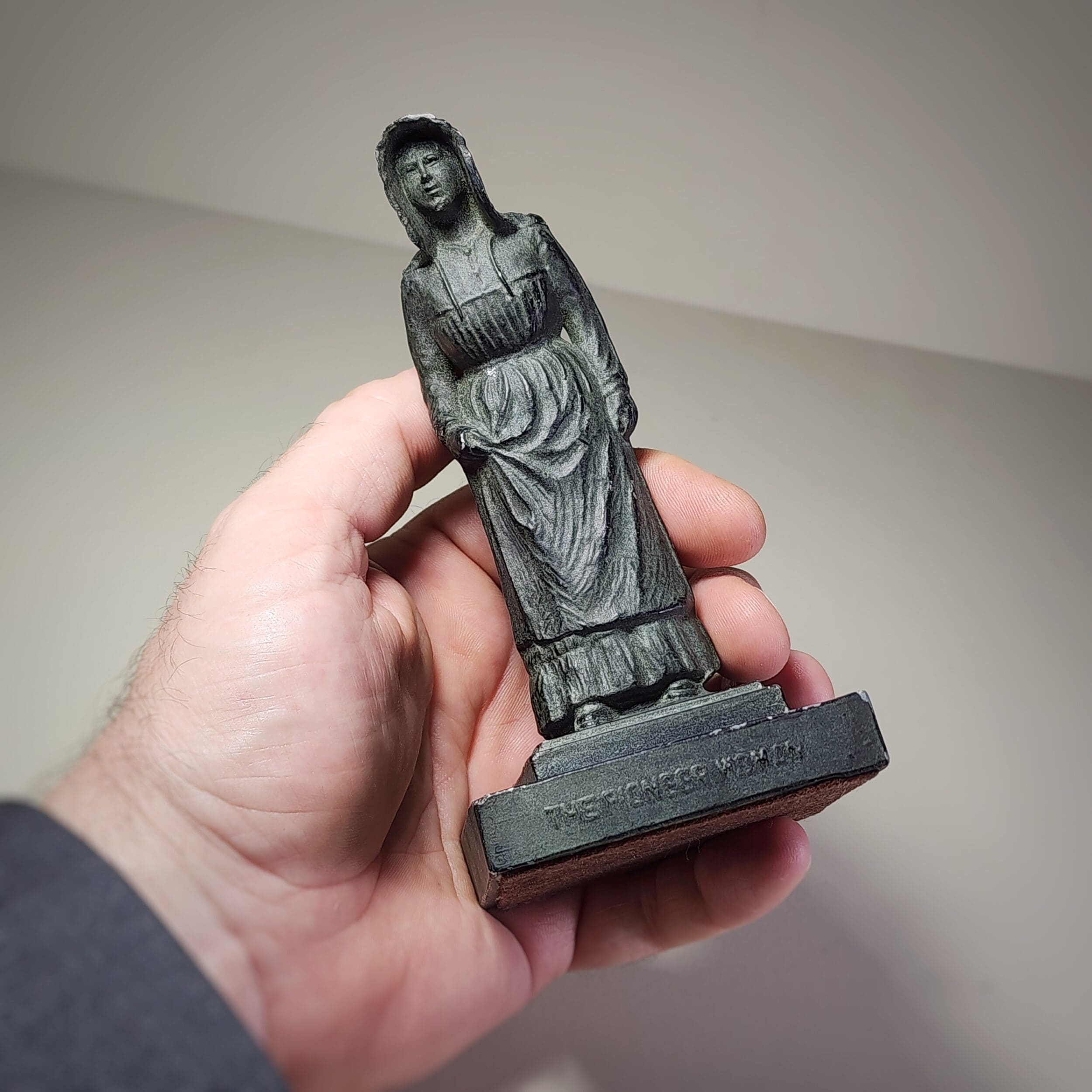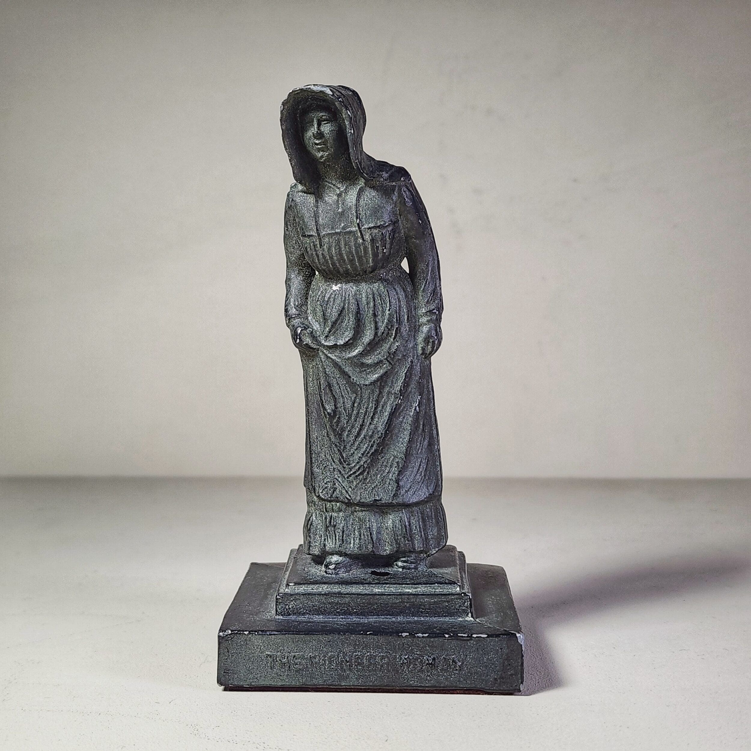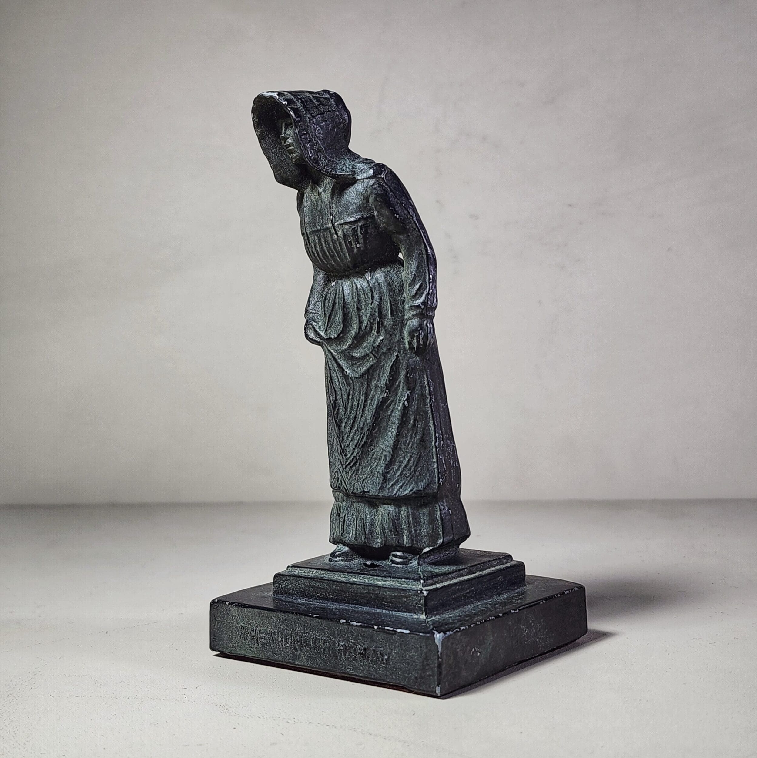 Meet the eerie little lady from a time long gone—a vintage black statue of a pioneer ghost with a haunting presence. Cloaked in a bonnet that shadows her stern face, she stands hunched and still, as if waiting for something… or someone. Her unsettling charm makes her perfect for lovers of phantoms, oddities, and all things curious. A true relic of the strange, with a felt bottom for gentle placement and a small hole imperfection on the base—just a touch of age adding to her mystery. She’s creepy, she’s quiet, and she might just be watching.