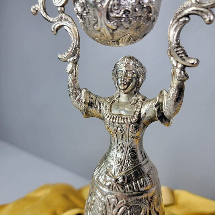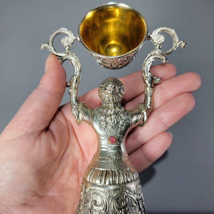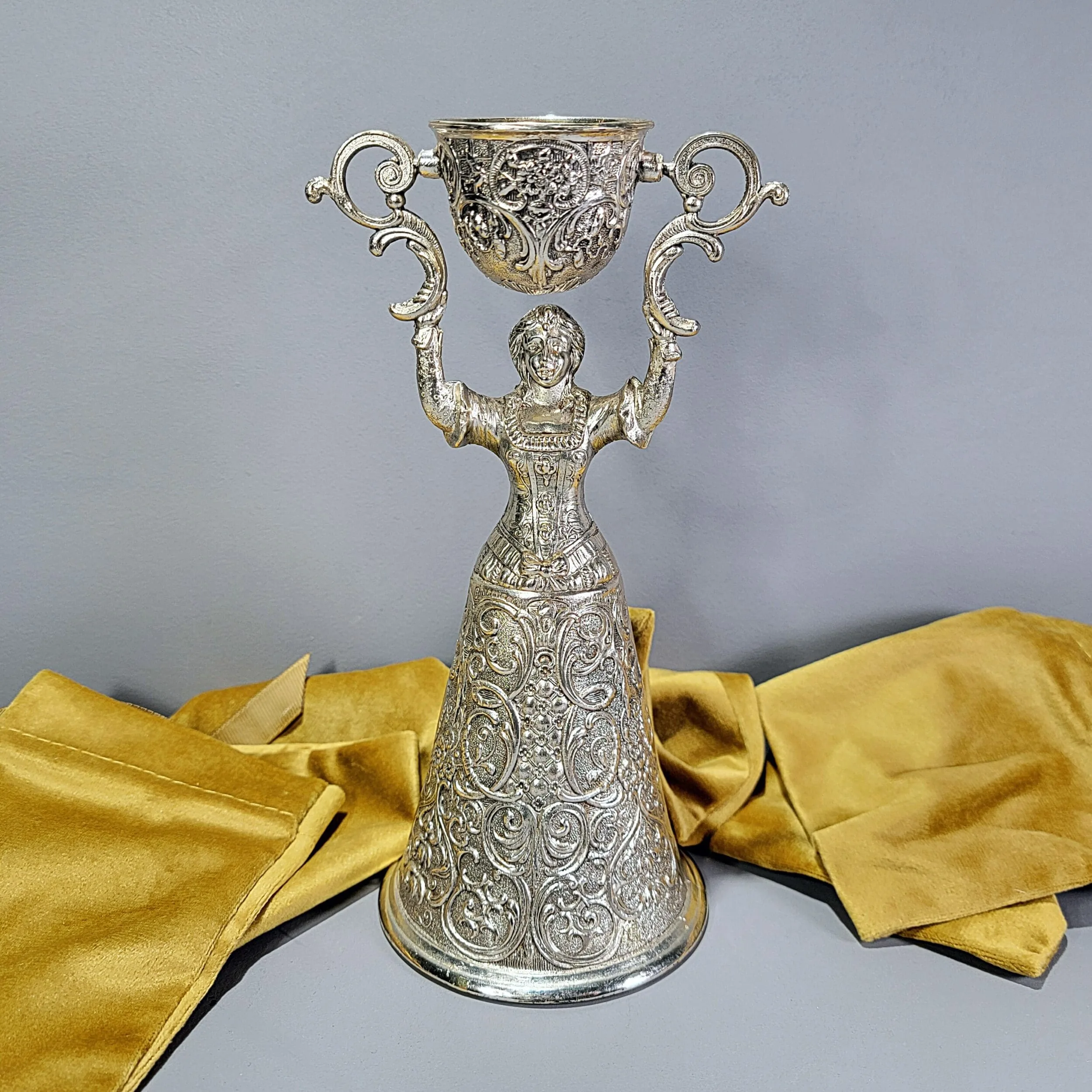 Legend holds that in the 1700s, a nobleman in Germany sought to secure a bride for his daughter, who had rejected wealthy suitors in favor of a goldsmith. To test the goldsmith’s skill and commitment, the nobleman demanded he craft a unique bridal cup: one that could be shared by two without spilling a drop. The ingenious goldsmith fashioned a silver figure of the girl with a hollow skirt for drinking and small swinging cups held by her raised arms.