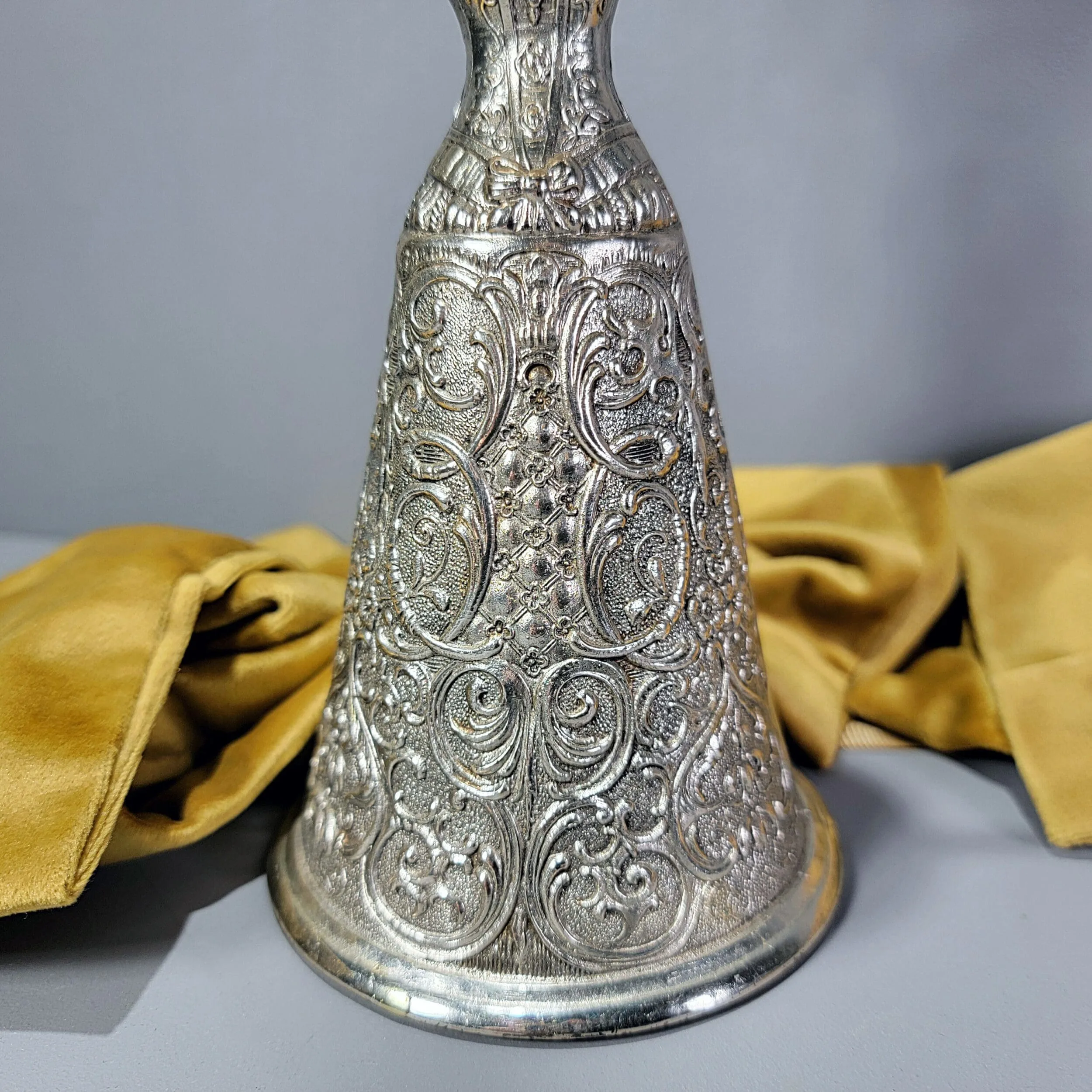 This vintage German wedding cup, also known as a Wager cup, is a dual cup designed in the likeness of a female figure adorned in a bell-shaped gown, with a second cup suspended above her head.