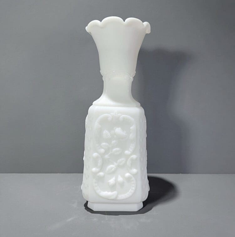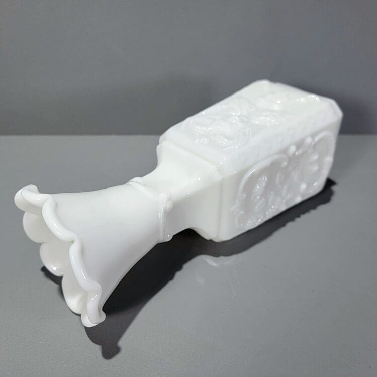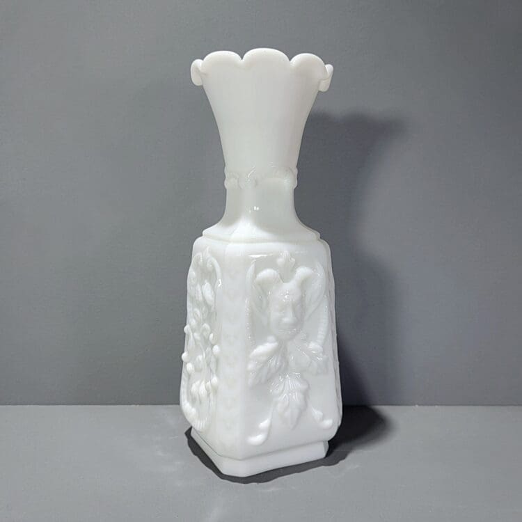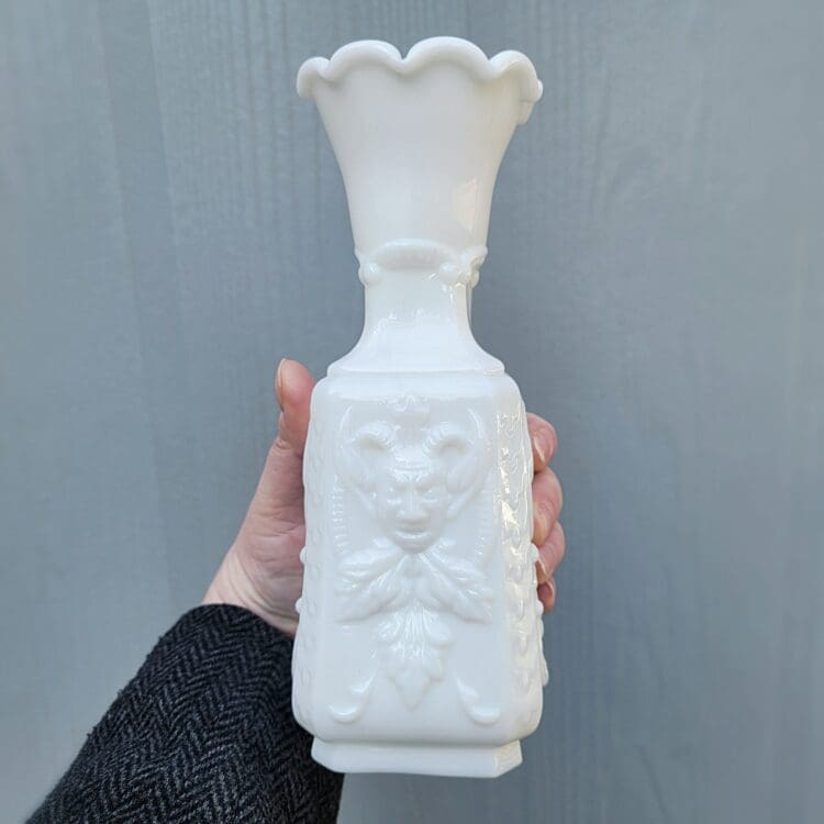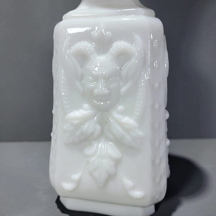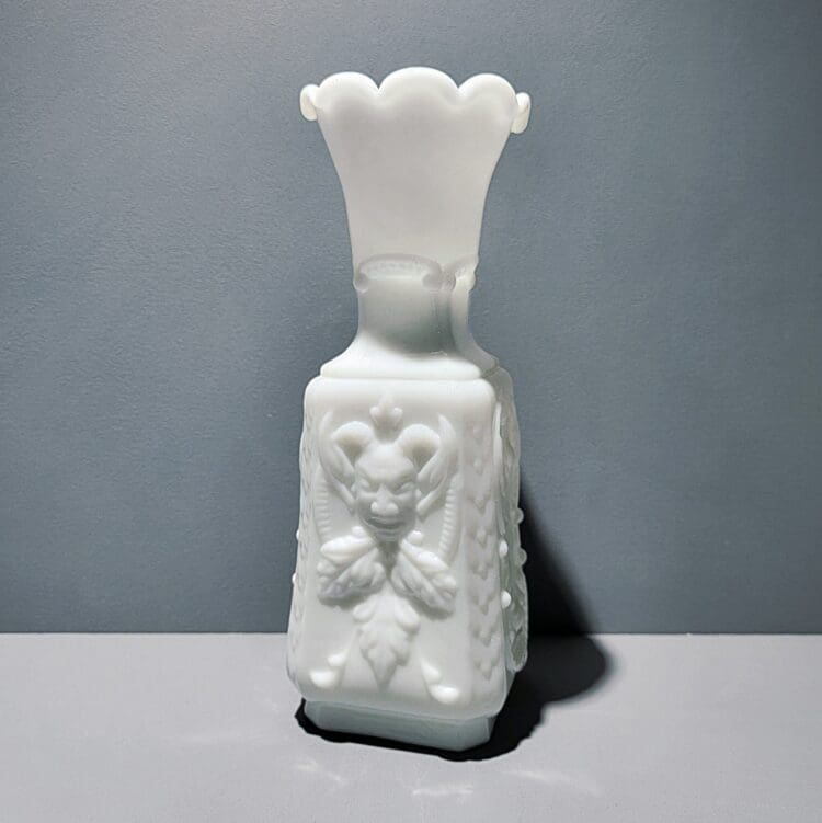 Bring a bit of mystery to your collection with this Vintage White Milk Glass Imperial Vase featuring an embossed Mephisto Devil face.