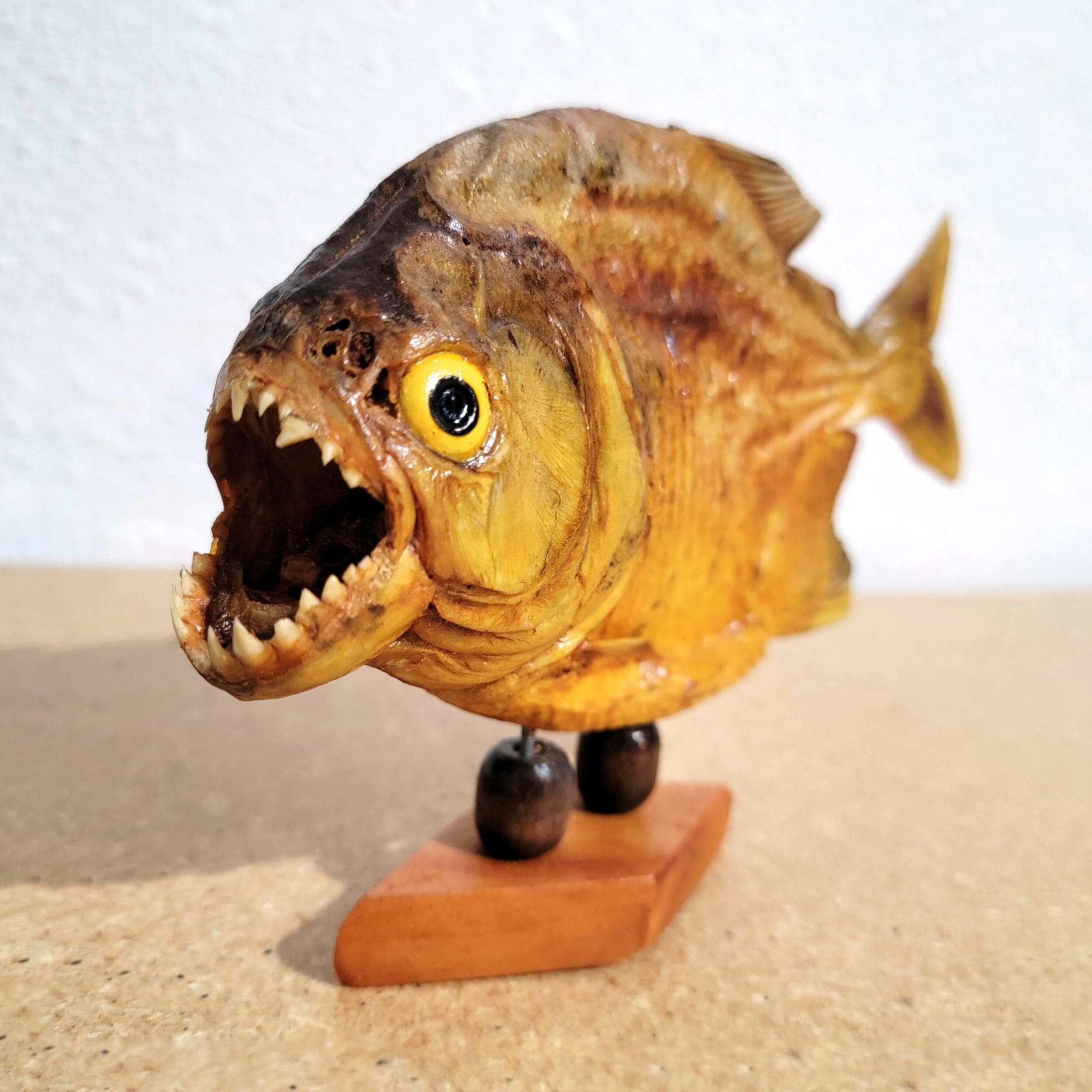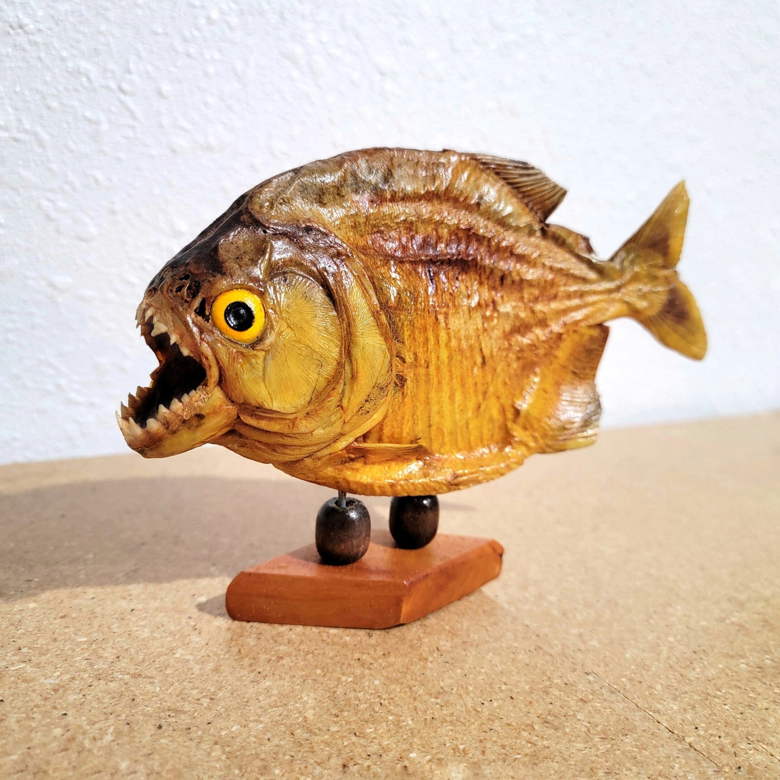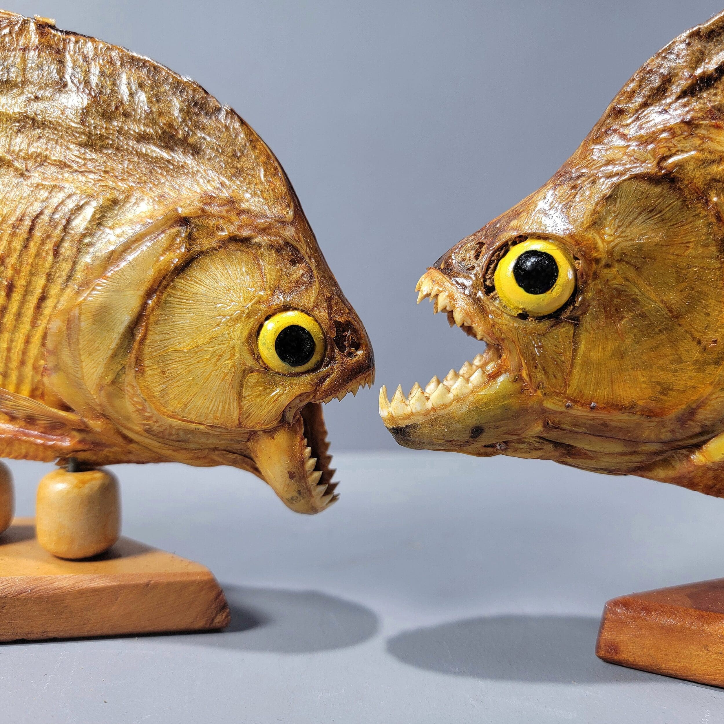 You will receive one Dried Piranha on a wooden base similar to the one pictured. Because it is a real natural specimen, each piece is unique so size, positioning, and coloration will vary. They range in size from between approx. 9 1/2 – 6 1/2 Inches long by between approx. 4 1/2 – 5 1/2 Inches tall. We will make sure to pick you out the biggest and scariest looking piranha available. As a vintage item, some may have minor imperfections such as pinholes or slight wear, adding to their character and authenticity.