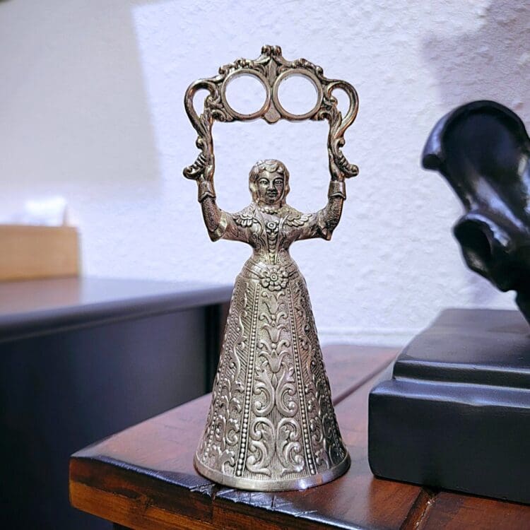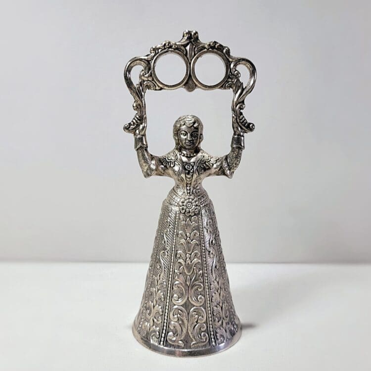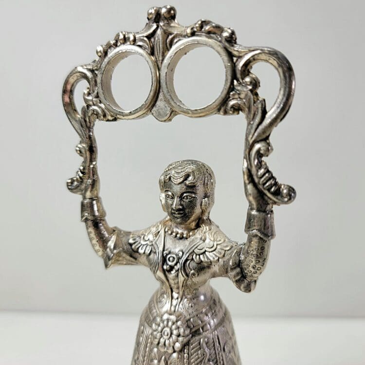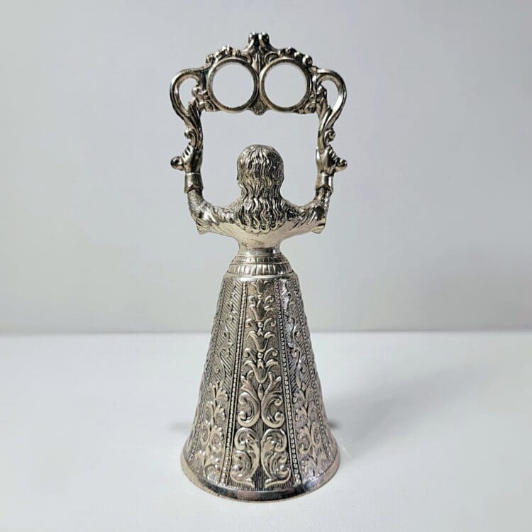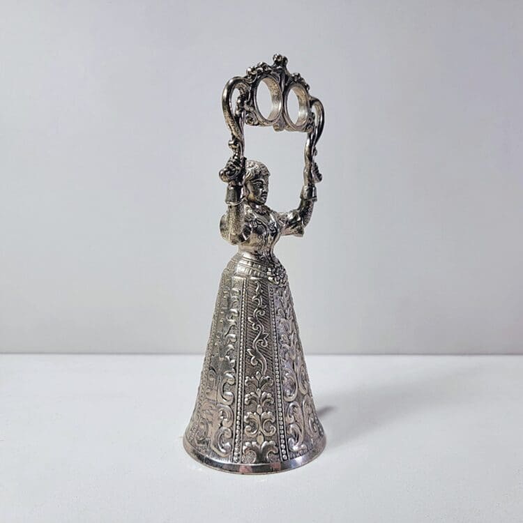 This elegant vintage silver colored wedding bell is in the form of a Victorian lady. She holds two rings in the air to symbolize the bride and groom and also functions as a holder.