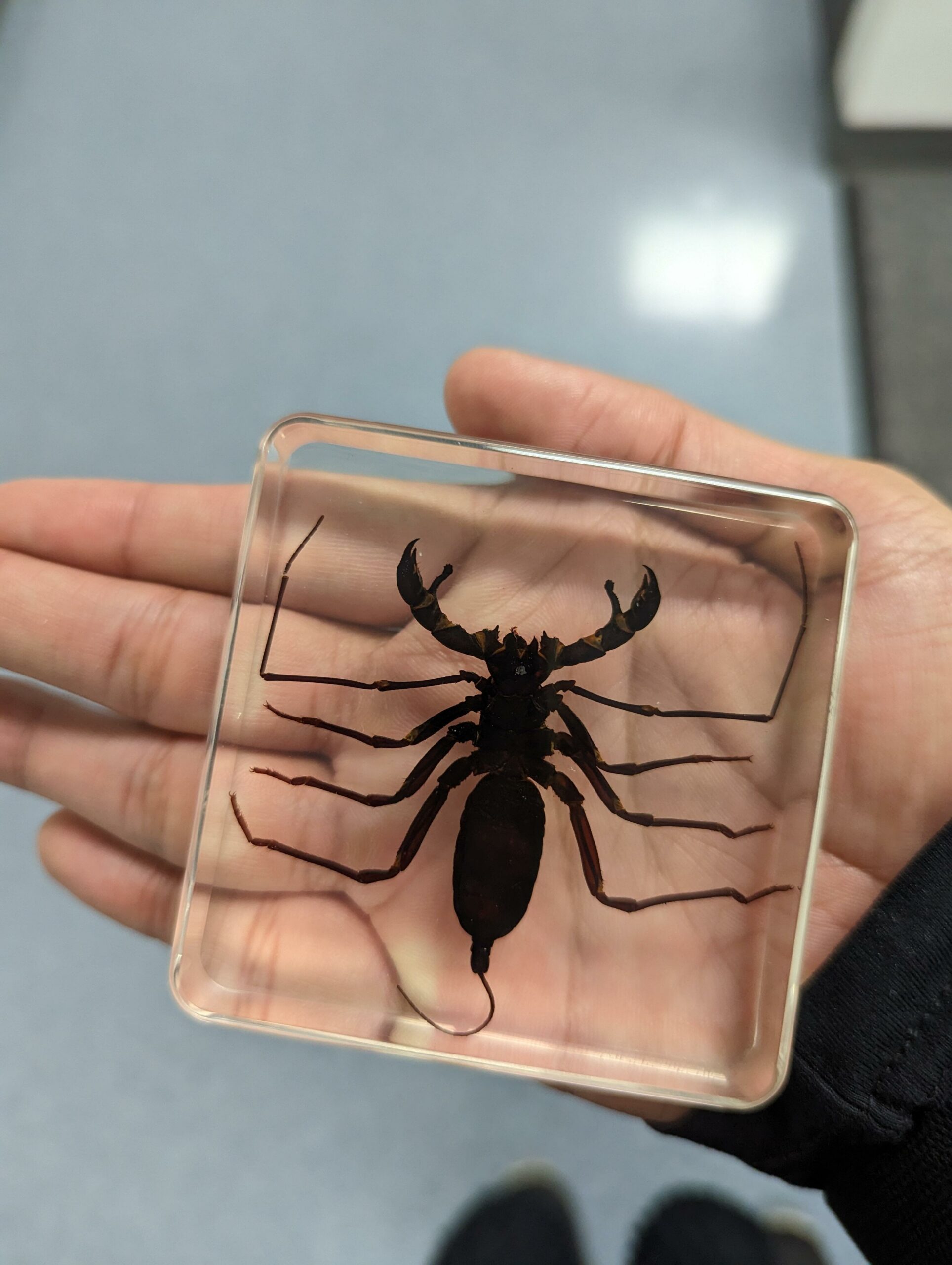 Approved by USFWS (Fish & Wildlife) legally obtained. This wicked looking creature is a Whip Scorpion in Resin. (Typopeltis Niger) It’s an Asian genus of whip scorpions or ‘Vinegaroons’ and currently the only member of subfamily Typopeltinaehis.