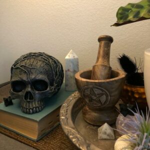 A mortar an pestle is a two piece set that is used prepare ingredients by crushing and grinding them into a powder or paste. People have been using them since the Stone Age. They have long been used to make food, medicines, potions and spells.
