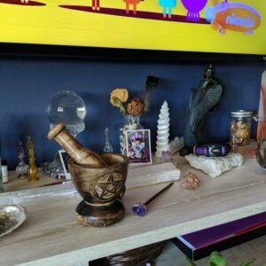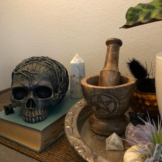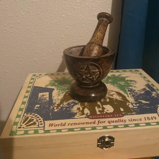 Brand new wooden Pentagram Mortal and Pestle. This beautiful little set is carved from mango wood, so it is light weight but extremely strong with a generous sized bowl for grinding herbs. This mortar and pestle set has been embellished with 3 pentagrams hand carved around the exterior.